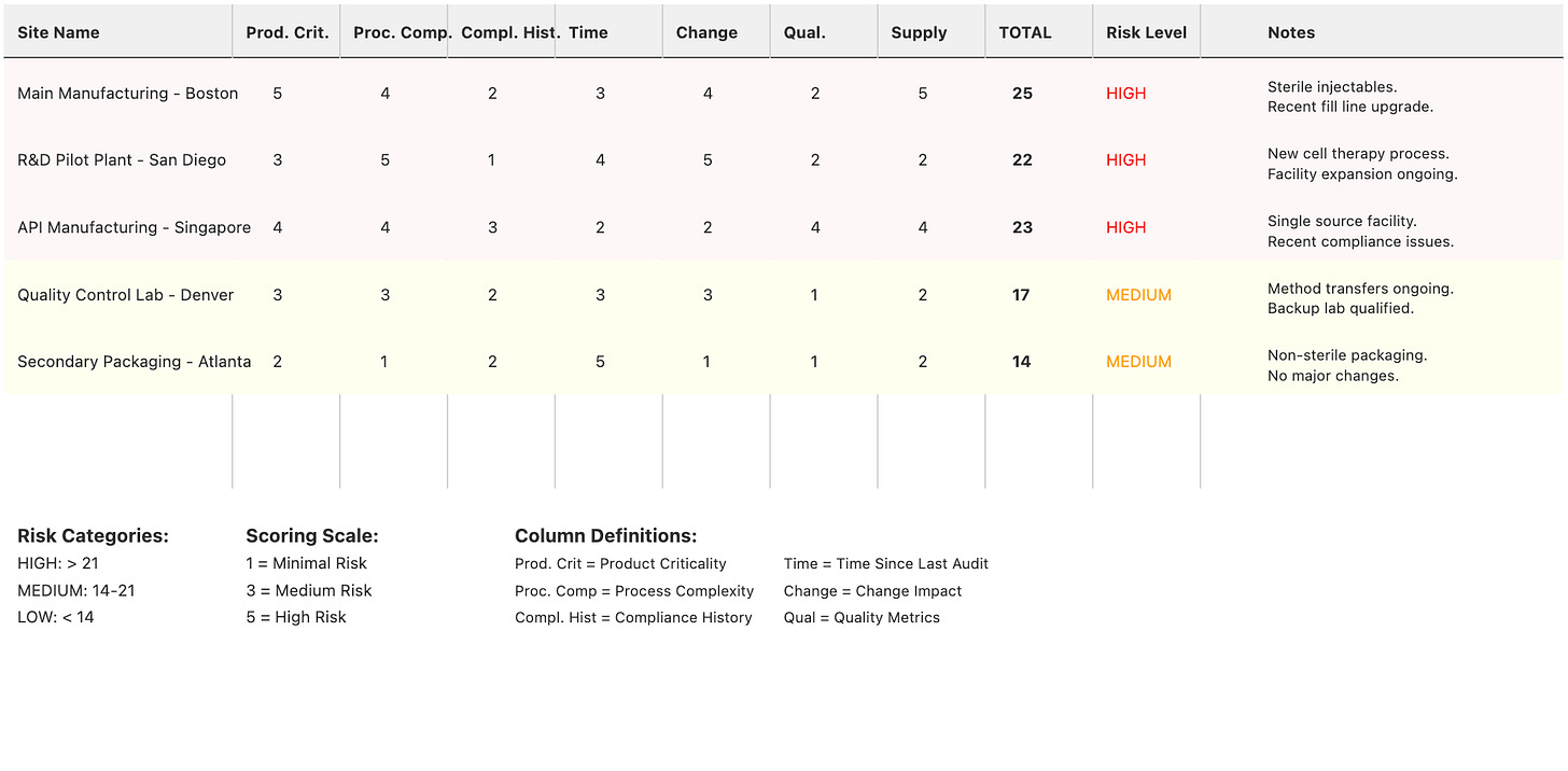 Use simple tools to manage your audit program. Successful audit programs start with straightforward, accessible tools that enable consistent execution. Rather than complex software solutions, focus on maintaining standardized templates in familiar formats like Excel or SharePoint. For risk assessments, create pre-weighted scoring matrices that account for both obvious factors (time since the last audit) and subtle ones like the complexity of material flow between buildings or the number of different regulatory markets served. Build communication templates with specific prompts for sites to provide pre-audit data, such as trending analyses of their top five CAPAs and any open change controls that impact GMP spaces or critical systems.