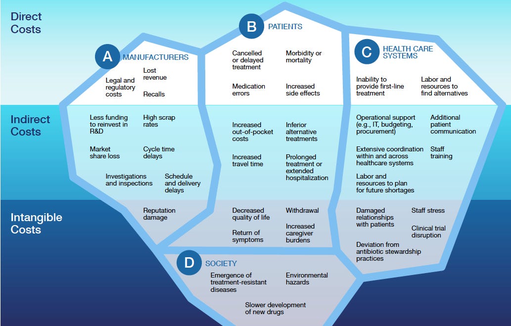 Direct costs: Recalls, lost revenue, legal and regulatory costs (the paper notes "poor quality management practices have caused billions of dollars in lost revenue for the pharmaceutical industry over the past two decades")
