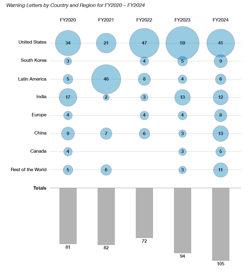 The FDA issued 105 warning letters for drug quality issues in FY2024—the highest total in five years. Domestic warning letters decreased from 59 to 41, while foreign warning letters increased from 35 to 64.