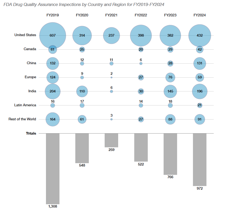 "In FY2024, more than 62% of drug quality assurance inspections were at foreign sites—an all-time high," the report states, with particular emphasis on India and China, where 34% and 28% of sites in the Site Catalog, respectively, underwent inspection.