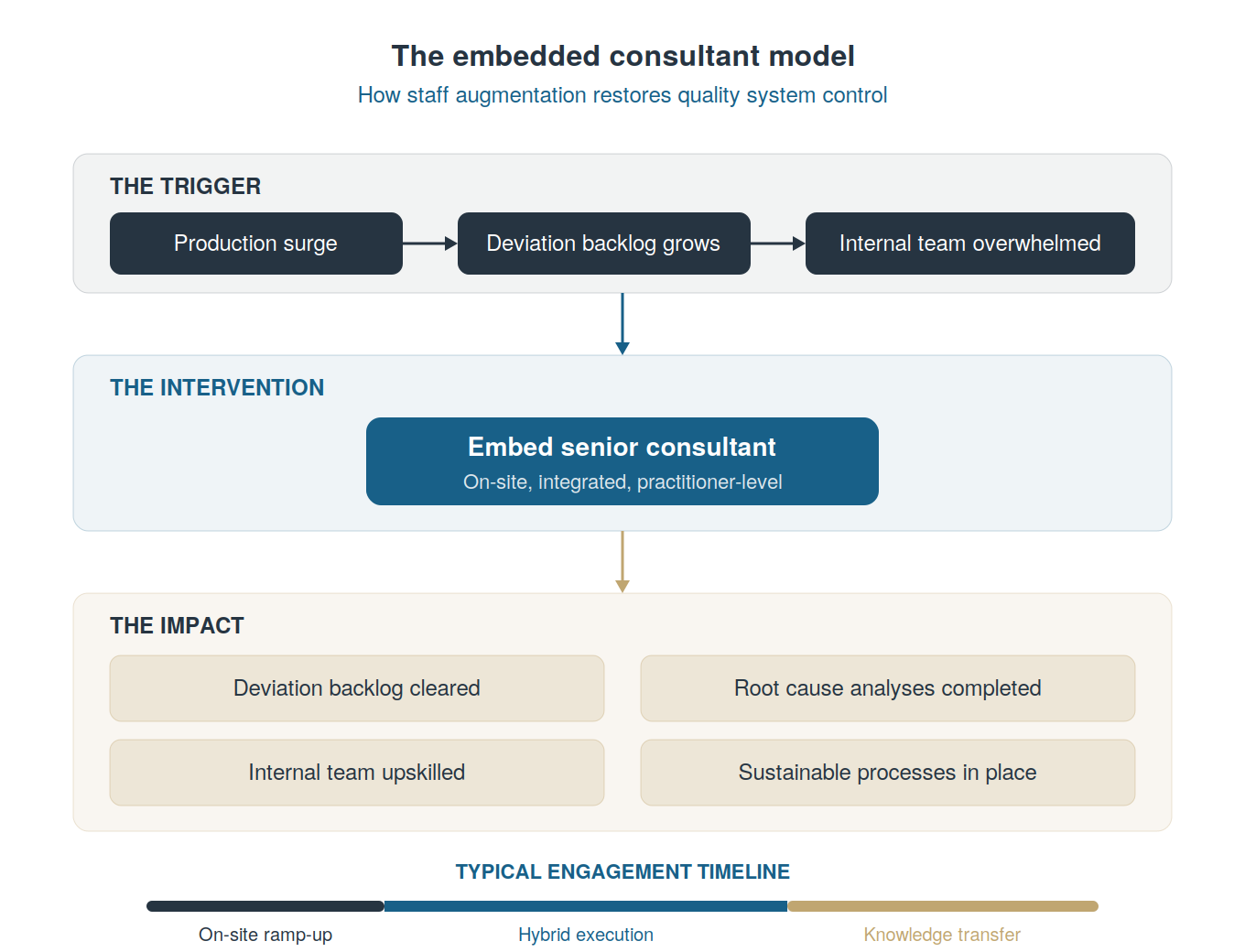 Flexibility that matches the work. Manufacturing deviation backlogs don’t typically shrink on a nicely predictable timeline. As soon as you clear five major deviations, three new ones might land on your desk. An embedded consultant model accommodates this reality in a way that fixed-scope project engagements can’t. Extensions are simple; the scope can flex. And when the backlog is finally under control (when the system is running smoothly and the team can sustain it internally), the engagement winds down naturally. (In some cases, our clients have offered FTE opportunities to our consultants to keep them on permanently.)